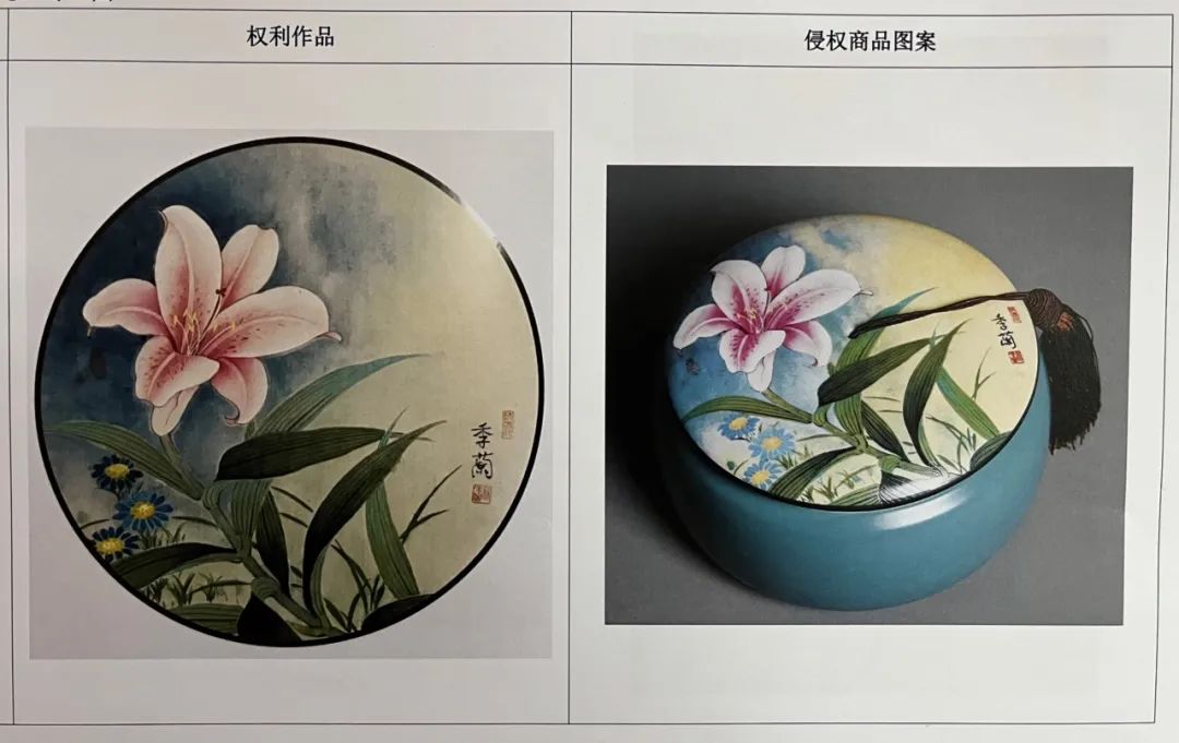 图 | 原创作品与侵权作品原来,梁某发现部分陶瓷电商未经其允许,在网上销售与其享有著作权的美术作品《百合》极其相似的陶瓷茶叶罐,遂向法院提交7份起诉材料。为提高纠纷化解效率效果,德化法院邀请了县人大代表、三班镇商会常务副会长徐婉娇共同参与调解。