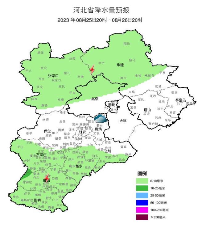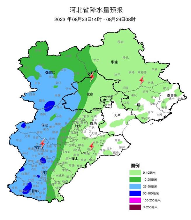 预计,8月23日14时至8月24日14时,张家口市(桥西区、桥东区、经开区、万全区、宣化区、怀安县、崇礼区、下花园区、赤城县、阳原县、蔚县、怀来县、涿鹿县)、保定市(涞水县、涞源县、阜平县、易县)、石家庄市(灵寿县、平山县、赞皇县)、邢台市(信都区、临城县、内丘县、沙河市)、邯郸市(丛台区、复兴区、峰峰矿区、永年区、涉县、磁县、武安市)等地局地可能发生山洪灾害(蓝色预警)。请注意防范。
