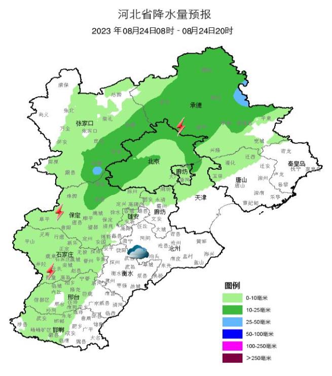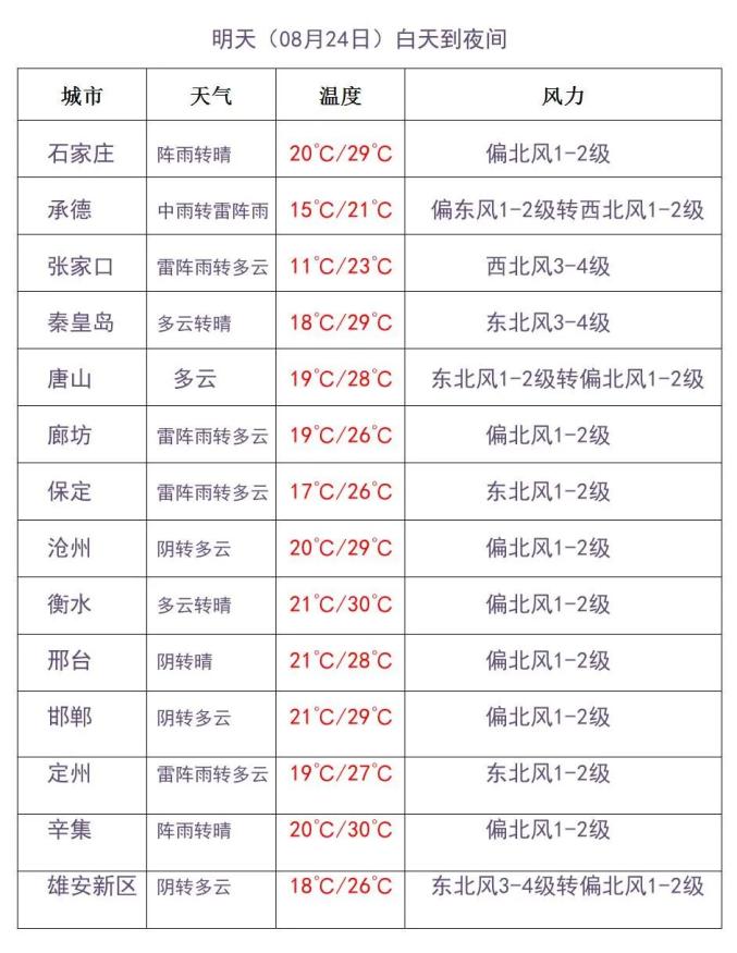 明天白天,张家口、承德、唐山北部、保定、廊坊、雄安新区、石家庄、邢台西部、邯郸西部阴有雷阵雨或阵雨,其中张家口南部、承德、保定北部有中到大雨,雷雨时局地伴有短时强降水、短时大风等强对流天气,其他地区多云。