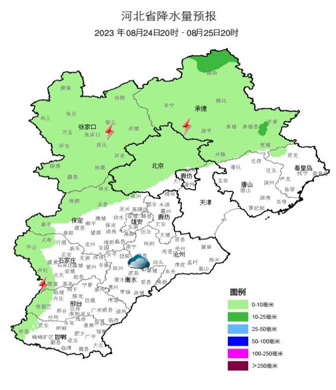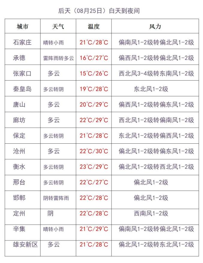 明天夜间到25日,张家口、承德、保定西北部和石家庄、邢台、邯郸三个地区的西部山区阴有雷阵雨或分散性阵雨,其他地区多云间晴。