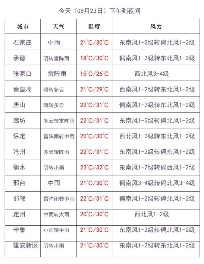 今天下午到夜间,全省多云转阴有雷阵雨或分散性阵雨,其中张家口、承德西部、保定中西部、石家庄、邢台中西部、邯郸有中到大雨,局地有暴雨,雷雨时局地伴有短时强降水、短时大风等强对流天气。