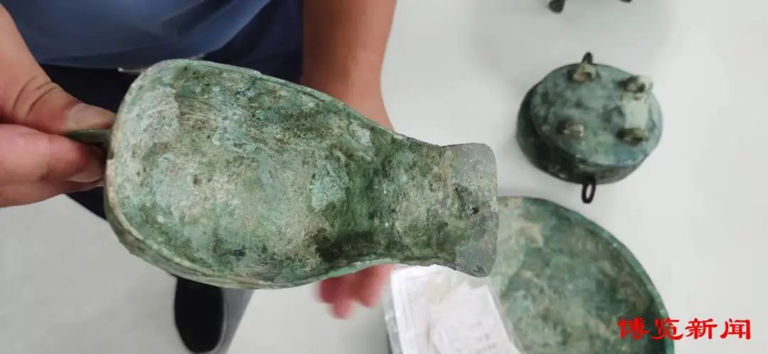 青铜器修复室中间的大工作桌上,几排最近刚刚修复成功的青铜器引人关注。这些锈迹斑斑的古器具,每一件都巧夺天工。一件铜匜,引起了记者的好奇。
