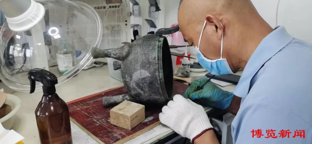 修复室里,一位工作人员正在修复一件罐状古器。他说,这件器具已经修复了三个月了,现在正在修复罐口,还得再有一周左右时间才能基本完成。