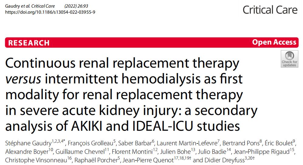 原标题:《【文献导读】严重急性肾损伤肾替代治疗中首次治疗方式为连续肾替代治疗或间歇血透的比较:AKIKI和IDEAL-ICU研究的二次分析》