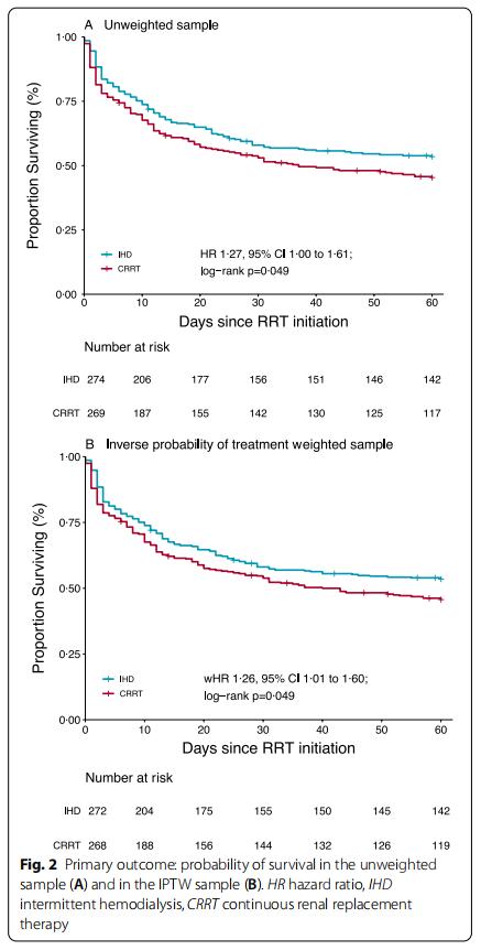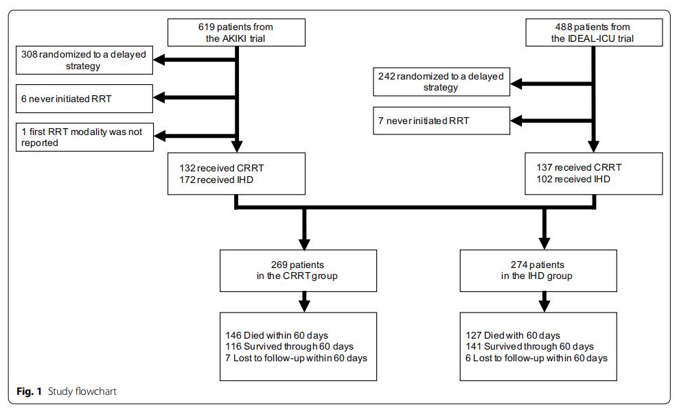 该研究是对两项开放实用的肾替代疗法(RRT)启动时机相关的多中心随机对照试验(AKIKI和IDEAL-ICU试验)的二次分析。我们纳入了分配到RRT早期启动策略的患者来模拟1项实验。在两项试验中,RRT模式的选择由临床医生自行决定,并且在患者ICU住院期间允许切换到任何1种模式。无患者使用持续低效率透析(SLED)等混合设备进行治疗。患者的治疗均遵循当前的指南共识。在本研究中,根据患者使用的第1种RRT方式分析结果。所有研究中心在IHD和CRRT中都使用了带有生物相容性膜的透析器。透析液和替代液中推荐的缓冲液为碳酸氢盐。推荐参数:IHD期间每周提供3.9 Kt/V;CRRT的排水量为20~25 mL/kg/h。通过评估主要结局指标:60天生存期(从RRT开始之日至死亡或第60天)。次要结局指标是ICU住院期间和出院时的状况,28天前肾脏恢复情况(定义为停止RRT且无利尿剂治疗时每24小时自发尿量高于1000mL或利尿剂治疗时每24小时自发尿量高于2000mL), 28天RRT依赖,ICU住院时间,无RRT的天数,28天时机械通气和血管升压药物。