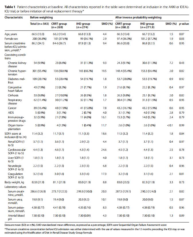 本研究共纳入543例早期接受RRT治疗的重度AKI危重患者(304例来自AKIKI试验,239例来自IDEAL-ICU试验)。在AKIKI和IDEAL-ICU试验中,随机分配到RRT开始之间的中位时间分别为2小时(IQR,1~3)和3小时(IQR,2~4)。269例患者以CRRT,274例患者以IHD作为第1种RRT方式(Fig 1)。患者基线时的特征如Table1所示。接受IHD的患者高血压发生率更高,血清肌酐水平更高,基线时凝血-SOFA评分更高。相反,接受CRRT的患者有更高的心血管和总SOFA评分。在269例最初接受CRRT的患者中,56例(20.8%)平均在6.4天切换到IHD。在274例最初接受IHD的患者中,48例(17.5%)平均在5.7天切换到CRRT。