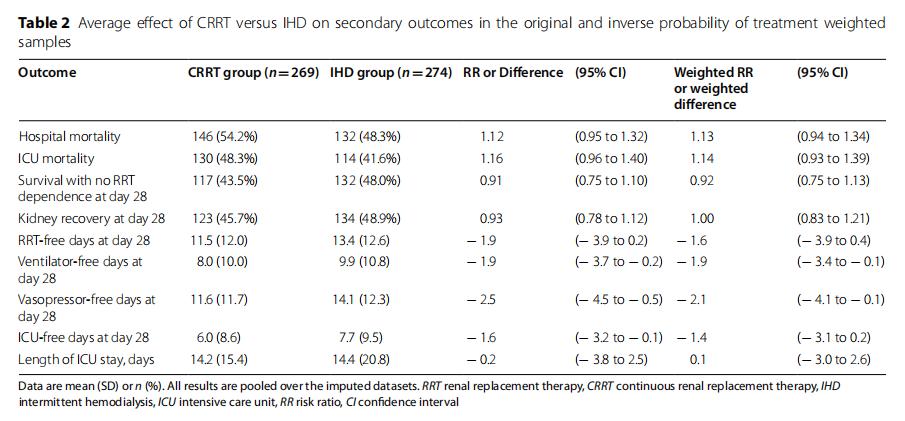 来源 Gaudry S, Grolleau F, Barbar S, et al. Continuous renal replacement therapy versus intermittent hemodialysis as first modality for renal replacement therapy in severe acute kidney injury: a secondary analysis of AKIKI and IDEAL-ICU studies[J]. Crit Care, 2022, 26(1): 93.
