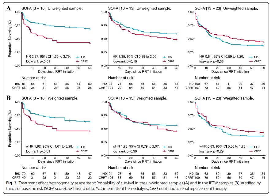 在按SOFA评分三分之一分层的分析中,我们发现在病情较轻的患者中,与CRRT相比,IHD具有更大的60天生存率(加权HR 1.82,95% CI 1.01~3.28;SOFA 3-10组,P<0.01)。相比之下,没有发现重症患者存在生存差异的证据(Fig3)。