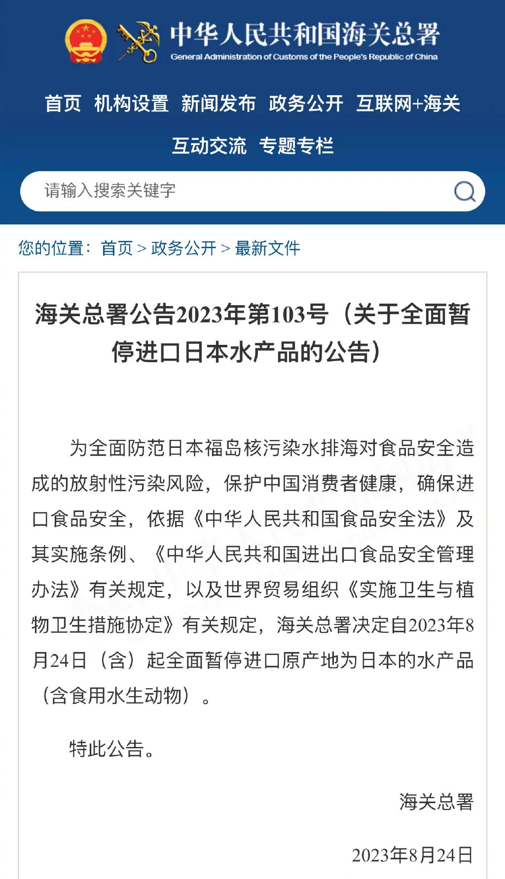 海关总署全面暂停进口日本水产品。为全面防范日本福岛核污染水排海对食品安全造成的放射性污染风险,保护中国消费者健康,确保进口食品安全,依据《中华人民共和国食品安全法》及其实施条例、《中华人民共和国进出口食品安全管理办法》有关规定,以及世界贸易组织《实施卫生与植物卫生措施协定》有关规定,海关总署决定自2023年8月24日(含)起全面暂停进口原产地为日本的水产品(含食用水生动物)。