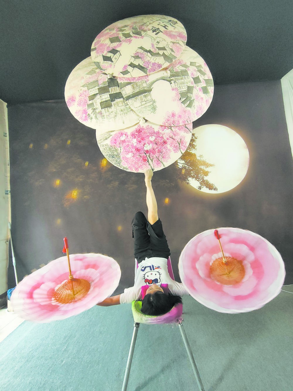 “学习之初,最难的是如何让伞‘老实地’待在脚上,找到平衡点之后,才能让伞‘听话’跟着脚的节拍舞动起来。”李晓蕊说,不管练习哪个杂技项目都必须有恒心,找到诀窍,勤学苦练,只有这样才能使节目更加成熟和完美。