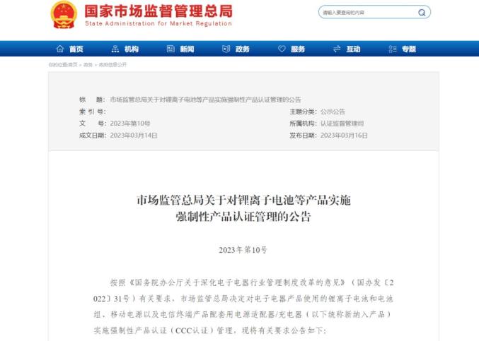 日前,国家市场监督管理总局关于对锂离子电池等产品实施强制性产品认证管理的公告要求:自2023年8月1日起,指定认证机构开始受理新纳入产品CCC认证委托,按照《强制性产品认证实施规则信息技术设备》和附件中列明的适用标准开展认证工作。