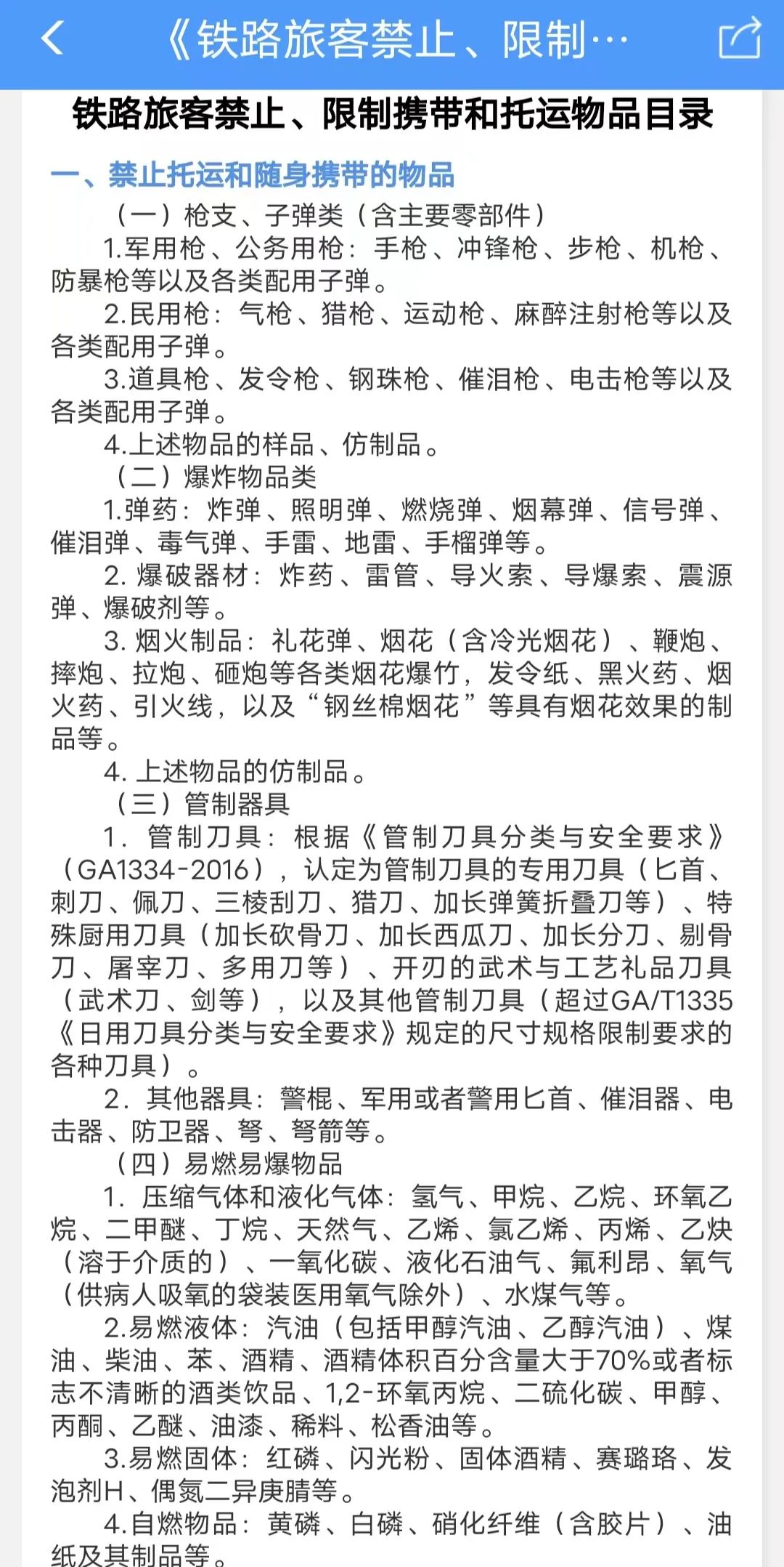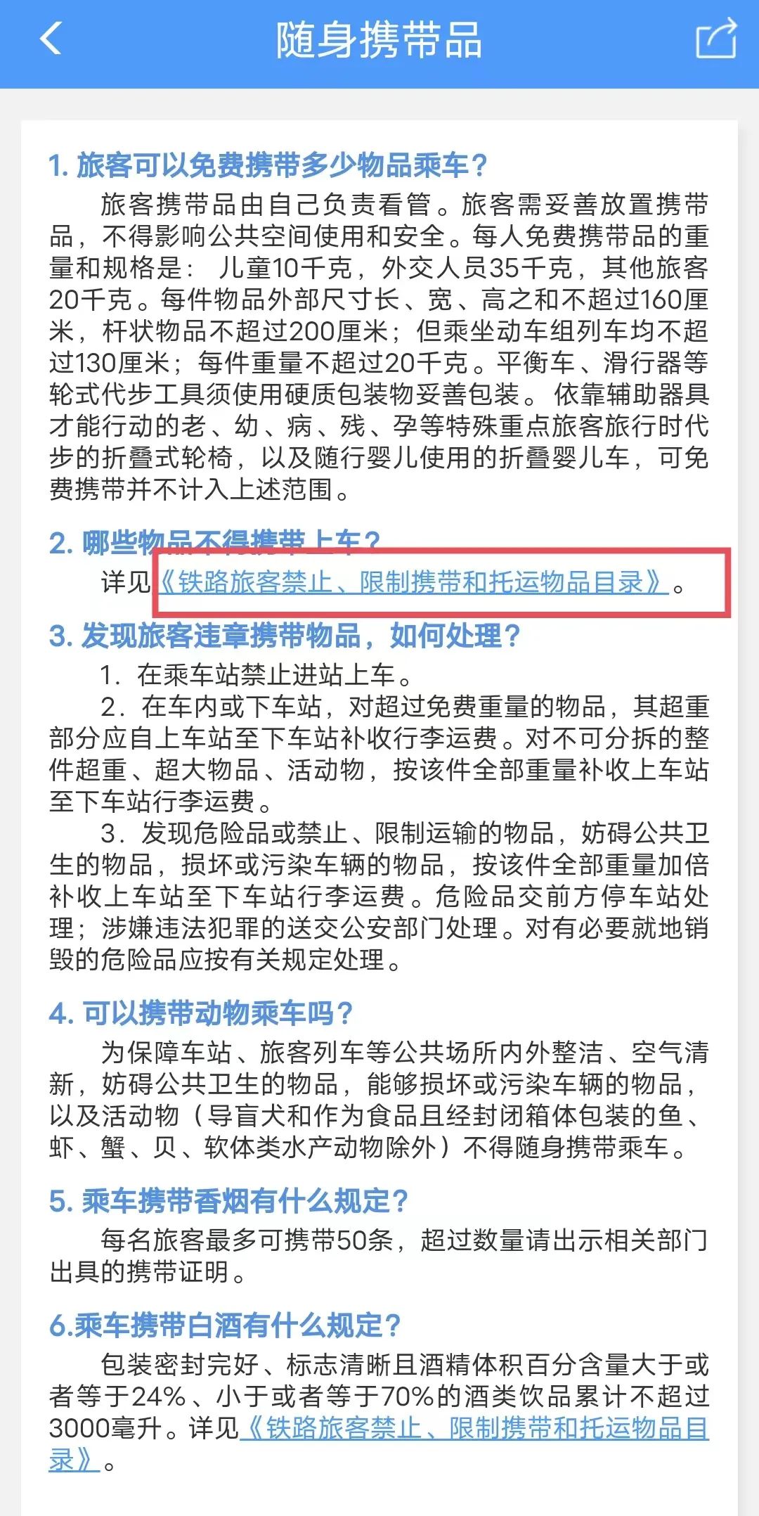 乘坐普通列车可携带长度不超过200厘米的杆状物品,乘坐动车组列车可携带长度不超过130厘米的杆状物品