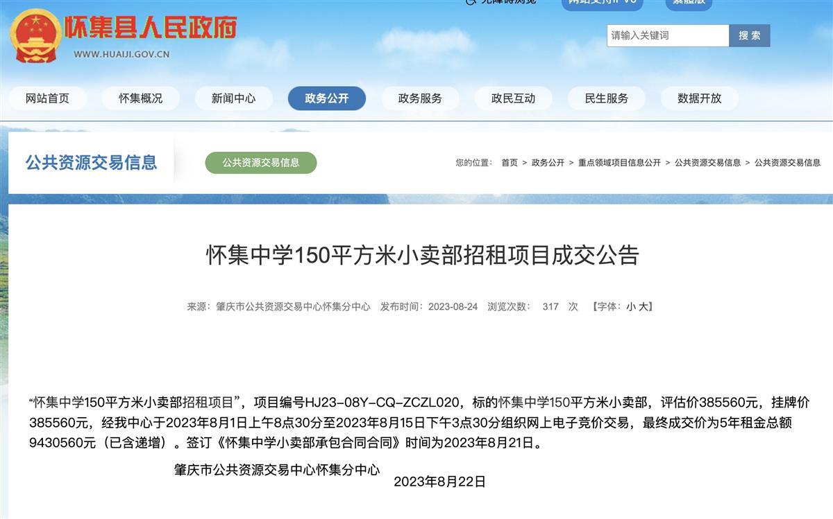 日前,广东省肇庆市怀集县人民政府网站发布的《怀集中学150平方米小卖部招租项目成交公告》显示,标的怀集中学150平方米小卖部,经网上电子竞价交易,最终成交价为5年租金总额9430560元。分摊到每年,租金约为188万元,这个数字确实让人咋舌,也迅速在网络引发热议。