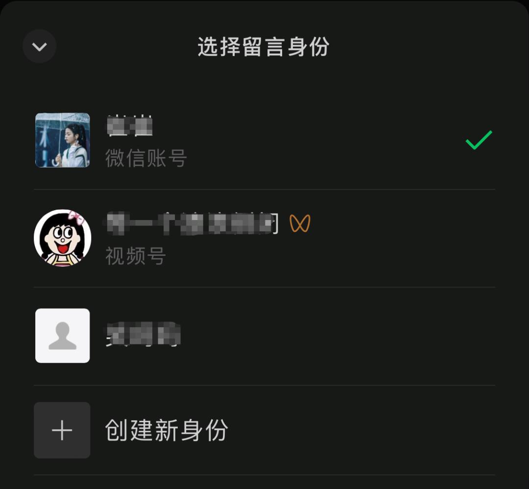 点击后,可以选择留言身份。以前是默认使用微信账号来作为唯一的留言身份,而现在支持选择微信账号、公众号、视频号或者自行创建的其他身份。