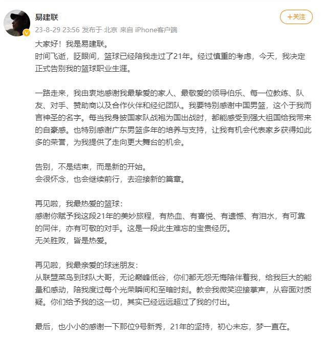 一路走来,我由衷地感谢我最挚爱的家人、最敬爱的领导伯乐、每一位教练、队友、对手、赞助商以及合作伙伴和经纪团队。我要特别感谢中国男篮,这个于我而言神圣的名字。每当我身披国家队战袍为国出战时,都能感受到强大祖国给我带来的自豪感。也特别感谢广东男篮多年的培养与支持,让我有机会代表家乡获得如此多的荣誉,为我提供了走向更大舞台的机会。