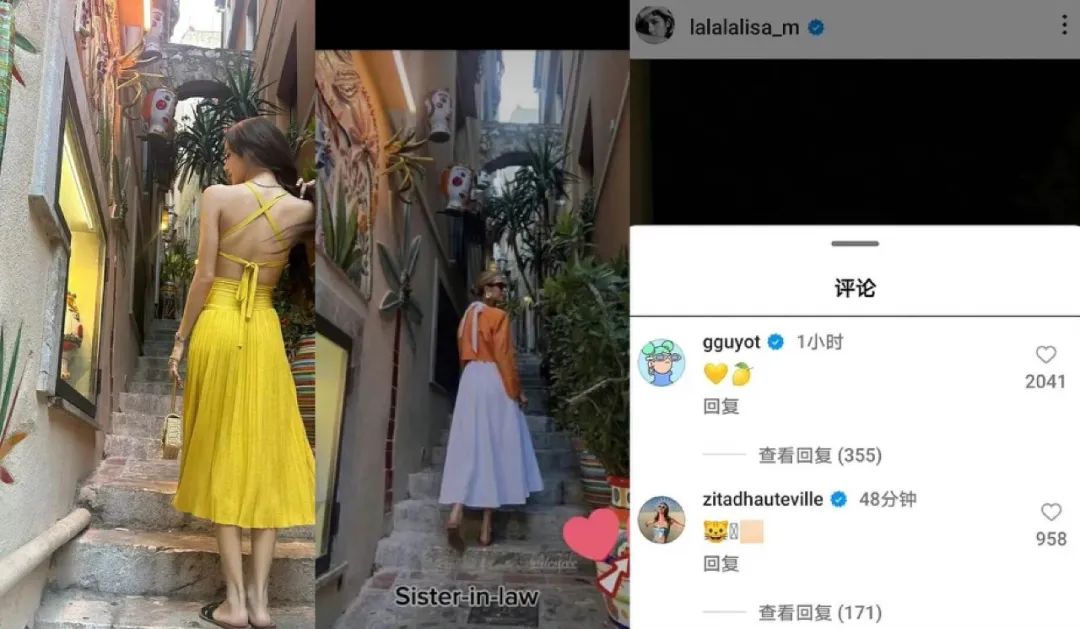 8月,继发布泳装照后,LISA还发布了在西西里岛的陶尔米纳游玩的动态,再次与LVMH集团二公子家夫人杰拉尔丁·盖约发布动态的地点重叠。