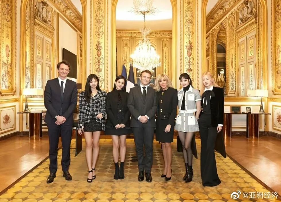 ▲法国慈善晚会后,法国总统夫妇(左四五)、弗雷德里克(左一)与LISA(右二)所在的BLACKPINK组合合照