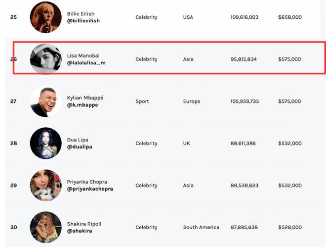 ins平台上首富依旧是拥有5.9亿粉丝的C罗。排行前列的也不乏泰勒斯威夫特、贾斯汀比伯等欧美歌手。但LISA以当时9500万粉丝和影响力,排行ins平台上第26富,甚至比贝克汉姆还高。