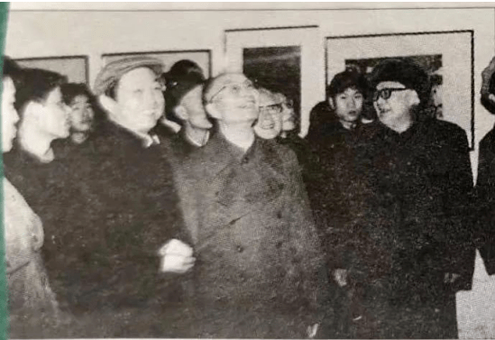 1987年1月8日“淮阴摄影·绘画·书法展”在北京中国美术馆开展,张爱萍将军(中)等出席,赵恺(左三)陪同