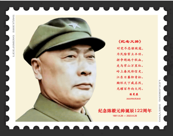 每年新四军将帅纪念日,北京新四军研究会黎济明就会为新四军老前辈们制作纪念邮票。这是纪念陈毅元帅诞辰122周年自制邮票(黎济明 创作)