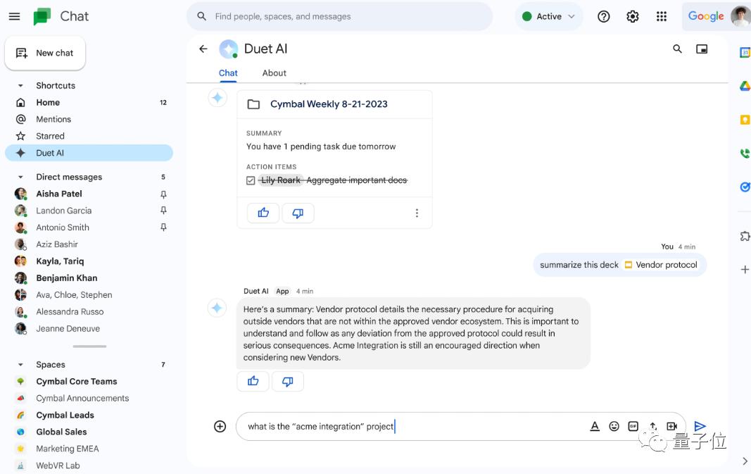 现在,在Google Chat上可以直接查找并提取其他人发的文件、并用Duet AI总结其中的内容等。