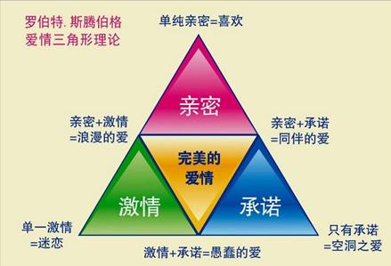 【爱情的元素】美国社会心理学家罗伯特·斯滕伯格提出了爱情三角形理论。他认为,爱情由亲密、激情、承诺三个基本元素组成。
