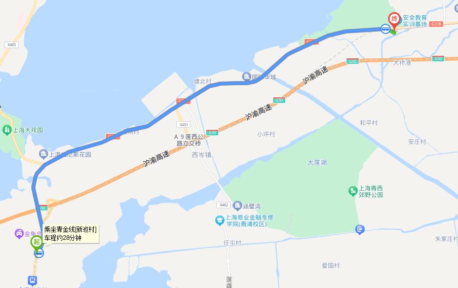 在沪青平公路培爱路站乘坐青金线或青金线(新池村)抵达沪青平公路山湾站。用时:30分钟