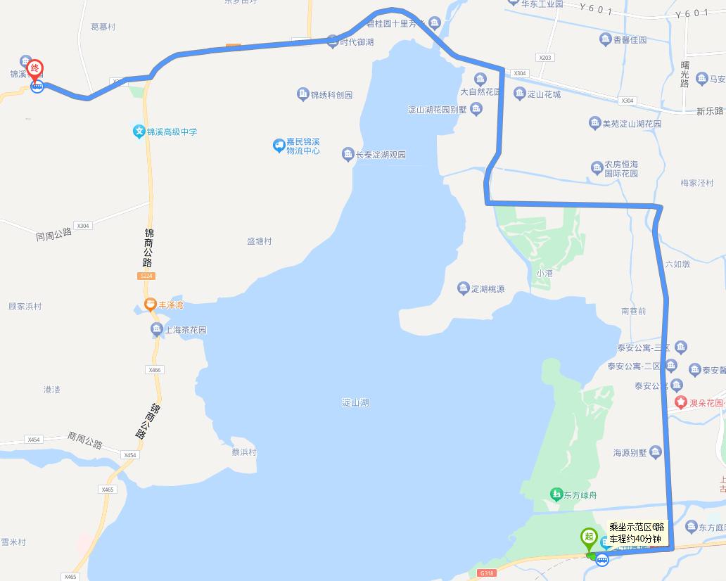 从沪青平公路山湾站步行至东方绿舟站,乘坐示范区6路抵达锦溪站,步行至锦溪古镇。用时:65分钟