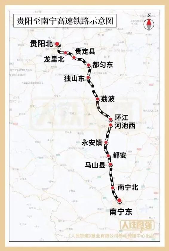 贵南高铁是“八纵八横”高速铁路网包头(银川)至海口通道的重要组成部分,线路自贵阳铁路枢纽龙里北站引出,向南经贵州省黔南布依族苗族自治州,广西壮族自治区河池市、南宁市,接入南宁铁路枢纽南宁东站,线路全长482公里,设计时速350公里。贵南高铁全线设贵阳北、龙里北、贵定县、都匀东、独山东、荔波、环江、河池西、永安镇、都安、马山县、南宁北、南宁东13座车站,其中贵阳北、南宁东为既有车站,其余为新建或改扩建车站。