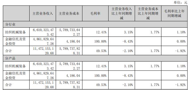 在2022年,纺织机械装备给经纬纺机贡献了约66.10亿元的营业收入,约占总收入的57.62%;而金融信托及资金投资贡献的营收约为48.62亿元,约占总营收的42.38%。