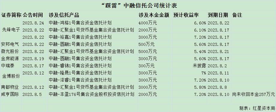 据红星资本局不完全统计,8月以来,至少有8家上市公司及新三板挂牌公司“踩雷”中融信托,购买的信托产品逾期未收到本金及投资收益,涉及金融从300万元到9000万元不等,预计收益率为5.40%-7.2%。