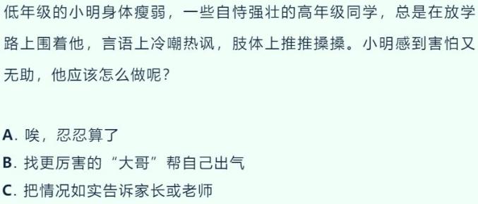 正确答案:C应对策略:这些高年级同学的行为,属于校园欺凌行为,小明应当认清这种行为的恶劣性质,避免自我隐忍,要积极采取法律途径保护自己。