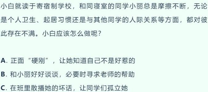 正确答案:B应对策略:集体生活必然面临生活习惯等差异,相互理解、相互谦让、理性沟通才是解决之道,千万不能采取极端手段。面对矛盾,小白可加强与小丽的沟通,共同寻求解决矛盾的方法,实现从个人到集体的自我调整与适应。