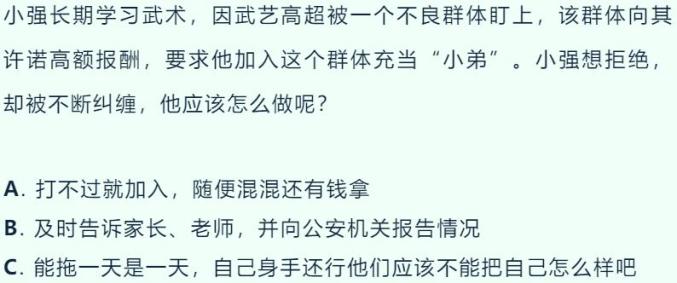 正确答案:B应对策略:《预防未成年人犯罪法》对不良行为、严重不良行为、违法犯罪行为进行了界定。当小强发现有人引诱其实施法律规定的不良行为甚至违法行为时,一定要多留一个心眼,避免因他人引诱走上犯罪道路。一旦加入不良群体,不仅可能被教唆犯罪,甚至可能遭遇威胁、胁迫……小强应当及时和家长、老师沟通,向公安机关报告上述情况,由公安机关追究该群体的法律责任。