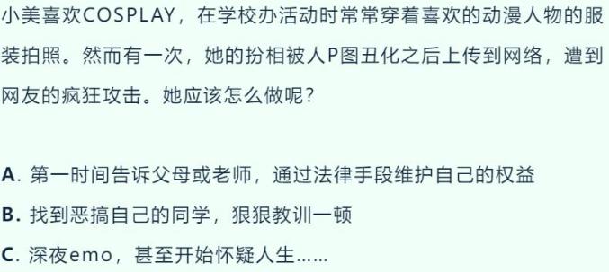 正确答案:A应对策略:《未成年人保护法》第七十七条规定,任何组织或者个人不得通过网络以文字、图片、音视频等形式,对未成年人实施侮辱、诽谤、威胁或者恶意损害形象等网络欺凌行为。小美及其父母有权通知网络服务提供者采取删除、屏蔽、断开链接等措施。网络服务提供者接到通知后应当及时采取必要措施制止网络欺凌行为,防止信息扩散。同时,根据法律规定,在网上侮辱、诽谤、猥亵未成年人或者恶意扭曲、损害未成年人形象,要承担相应民事责任,小美及其父母可以追究相关人员的侵权损害赔偿责任。
