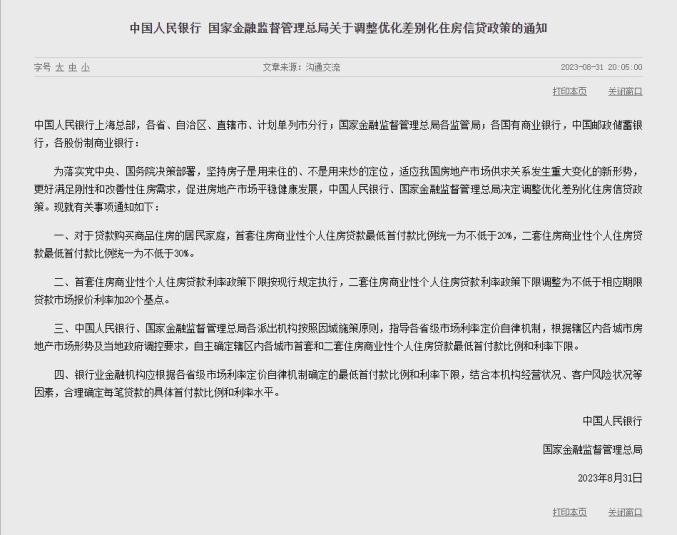为贯彻落实党中央、国务院决策部署,中国人民银行、金融监管总局发布通知,对现行差别化住房信贷政策进行了调整优化,支持各地因城施策用好政策工具箱,引导个人住房贷款实际首付比例和利率下行,更好满足刚性和改善性住房需求。