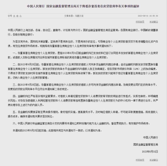 中国人民银行 国家金融监督管理总局关于降低存量首套住房贷款利率有关事项的通知