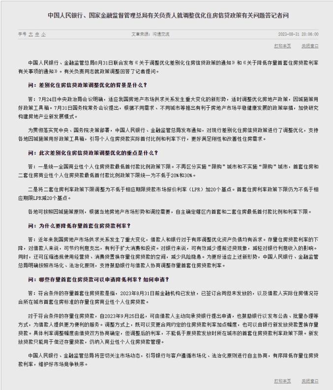 中国人民银行、国家金融监督管理总局有关负责人就调整优化住房信贷政策有关问题答记者问