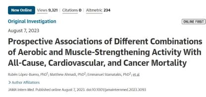 [1] Prospective Associations of Different Combinations of Aerobic and Muscle-Strengthening Activity With All-Cause, Cardiovascular, and Cancer Mortality. JAMA Intern Med. August 7, 2023.