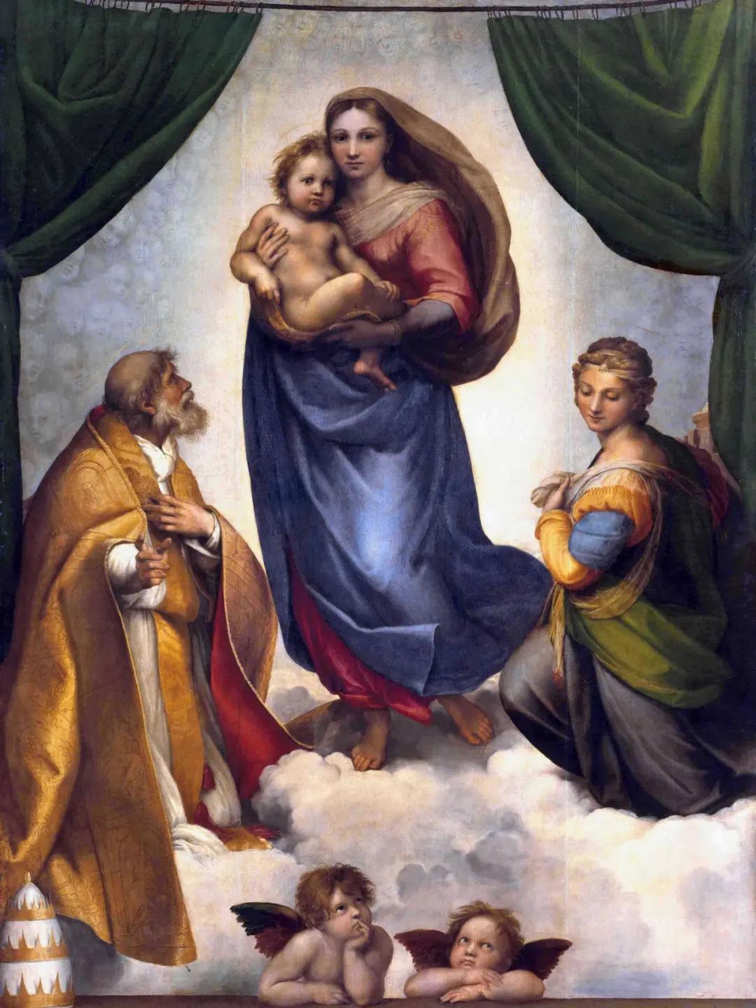 谁没有写过拉斐尔与他的《西斯廷圣母》呢?据说,人类在经过中世纪数百年泯灭人欲的宗教专制之后,终于通过血肉之躯认识了自己的个性,终于从自身和周围的事物中发现了世界与上帝——乌尔比诺的天才画作将这一切展现得最为淋漓尽致。或许,从某方面说的确是这样的。在画家的笔下,圣母马利亚宛若普通农妇,画面所呈现的她的心理状况遵循了真实的生活:她为儿子的命运忧伤,因他将被作为祭品献给世人,尽管这种牺牲是为了救赎人类免于诱惑。