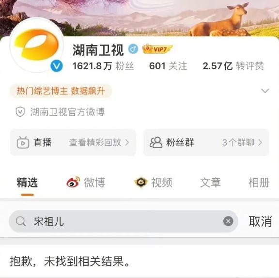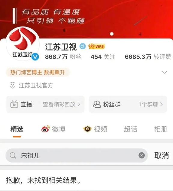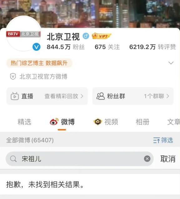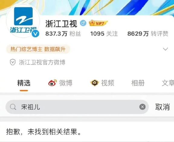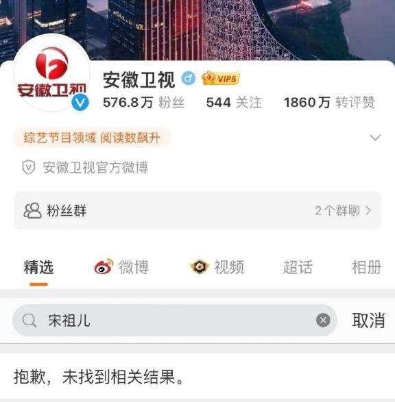 经搜索查证,北京卫视、湖南卫视、浙江卫视、江苏卫视、安徽卫视微博确已无法搜索到宋祖儿相关内容。