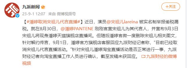 据九派新闻报道,就在8月30日,@潘婷PANTENE官宣宋祖儿为其代言人,并宣布9月3日宋祖儿将现身潘婷天猫旗舰店直播间,但随后潘婷官微一度删除宋祖儿相关图文。