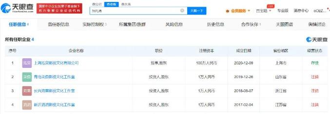 天眼查显示,宋祖儿(原名孙凡清)共关联4家企业,其中,由其个人独资的三家企业,长兴洵美影视文化工作室、新沂涓涓影视文化工作室、青岛柒鼎影视文化工作室分别于2020年1月、2021年12月、2023年3月注销。目前存续状态仅剩上海泓泉影视文化有限公司1家。