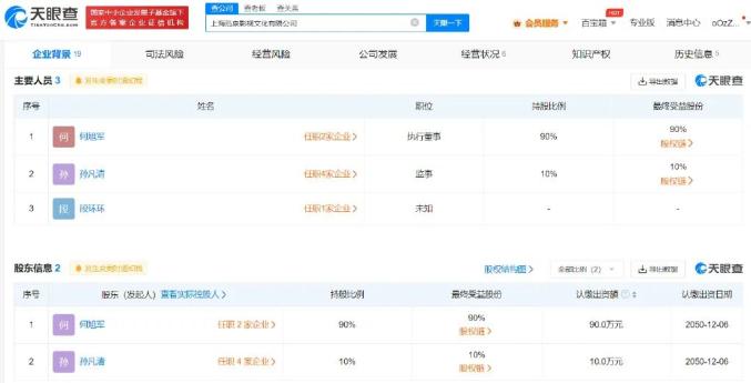 泓泉影视文化公司成立于2020年12月,注册资本100万人民币,于今年3月发生多次工商变更,宋祖儿持股比例由99%变更至10%,最终受益人、实际控制人变更为何旭军,年报信息显示,该公司参保人数为0。