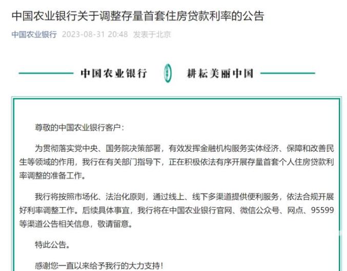 中国农行银行在公告中称,该行“正在积极依法有序开展存量首套个人住房贷款利率调整的准备工作”,后续将在官网、微信公众号、网点、95599等渠道公告相关信息。