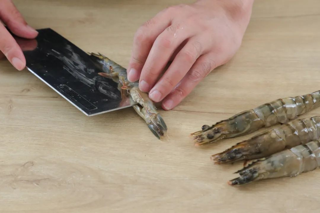 操作步骤1.黑虎虾解冻后,在虾肚子处剖开。