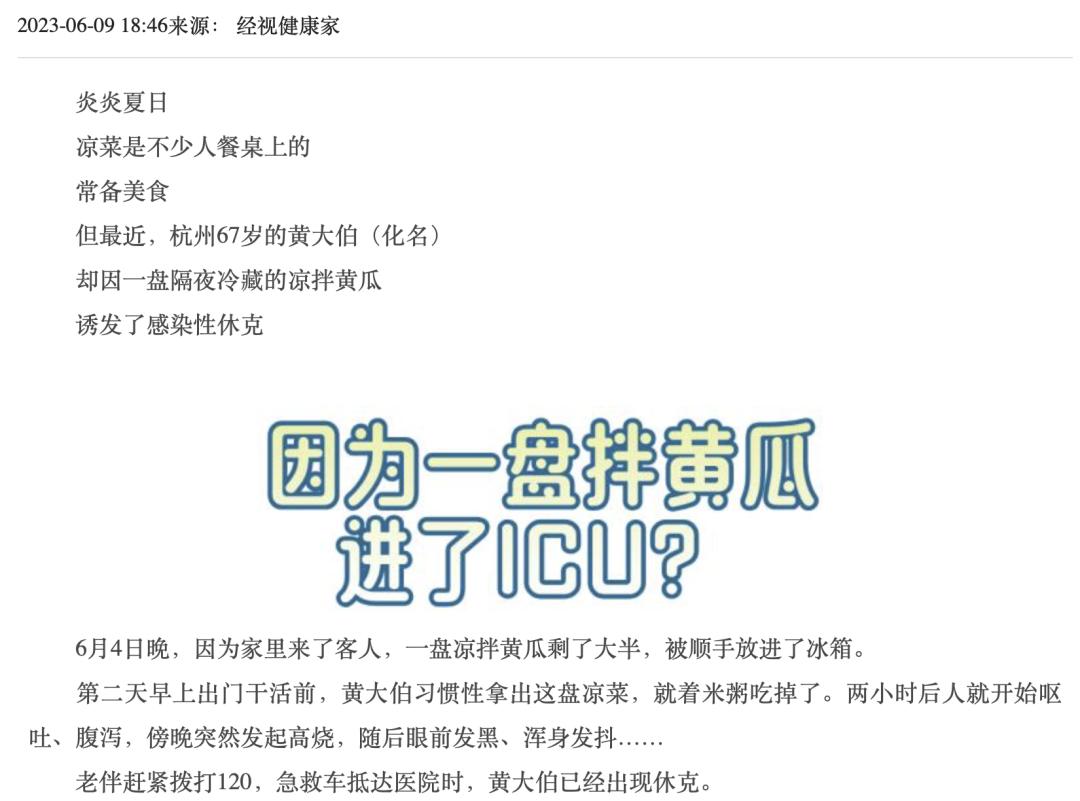 之前就有新闻爆出,有人早上喝粥,搭配了冷藏隔夜的凉拌黄瓜,结果诱发了感染性休克。