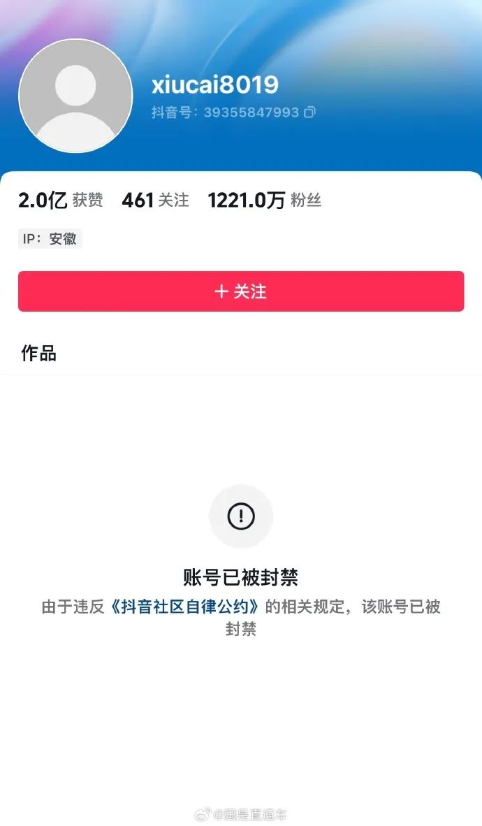 对此,抖音相关负责人表示,该账号违反平台相关规定,已封禁。