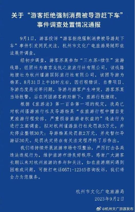 4.游客拒绝强制消费被导游赶下车,杭州通报:近日,针对“游客拒绝强制消费被导游赶下车”事件,杭州市文化广电旅游局发布通报称,因行程错误、自费项目等问题,导游与游客产生冲突,游客当场报警。该局对杭州谨游旅行社处罚款5万元,并停业整顿30天,导游杨某处罚款2万元,并处暂扣导游证30天。(环球时报)