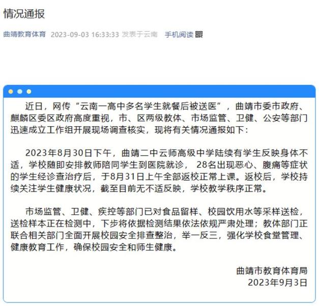 8.28名学生就餐后被送医!官方通报:3日,网传云南一高中多名学生就餐后被送医,曲靖市教育体育局发布情况通报称,8月30日下午,曲靖二中云师高级中学陆续有学生反映身体不适,学校随即安排教师陪同学生到医院就诊,28名出现恶心、腹痛等症状的学生经诊查治疗后,于8月31日上午全部返校正常上课。返校后,学校持续关注学生健康状况,截至目前无不适反映,学校教学秩序正常。(正义网)